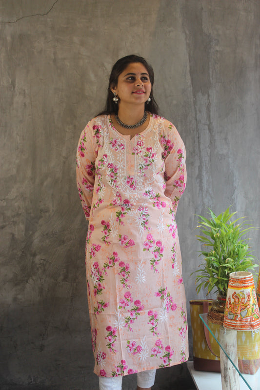 Peach Floral Malmal Cotton Chikankari Kurti - Handmade Embroidery by Loomkar
