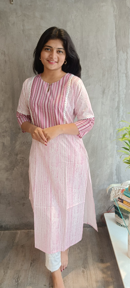 Soft Pink Floral Handloom Cotton Kurti-Loomkar Raipur