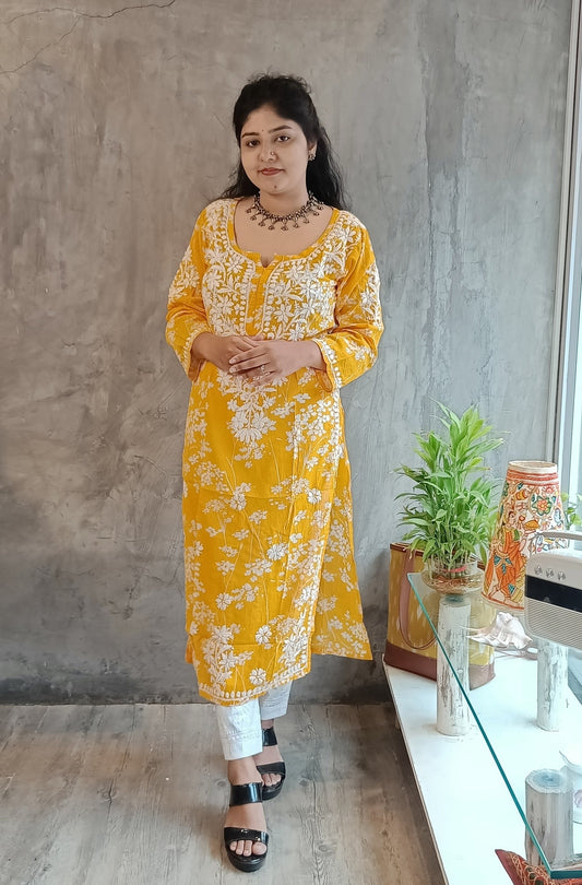 Yellow Mal-Mal Cotton Chikankari Kurti - Best Handloom in Raipur