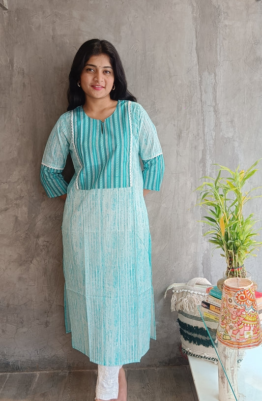 Soft Teal Cotton Chikankari Long Kurti